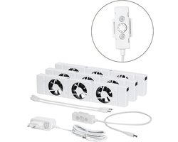 • Fluisterstil & zeer zuinig: <20 dB(A) en minder dan €0,32 per jaar stroomverbruik; verliesvrije 12V-adapter verbruikt niets als ventilatoren uitstaan