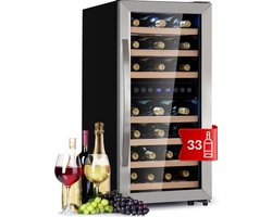 De Klarstein Vinamour 33 Duo wijnkoelkast zorgt voor het beste wijnplezier. Dankzij twee afzonderlijke koelzones geeft hij 33 flessen rode en witte wijn de juiste temperatuur. Via het touch paneel kunnen koeltemperaturen van 5 tot 18 °C worden ingesteld - ook ideaal voor sprankelende champagne. Daarbij creëert hij een luxe ambiance en presenteert de edele druppels op een bijzondere manier - de witte verlichting vestigt elegant de aandacht op de opgeslagen wijnen en de glazen panoramadeur biedt een perfect zicht.